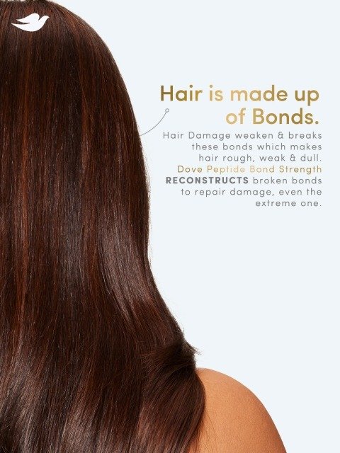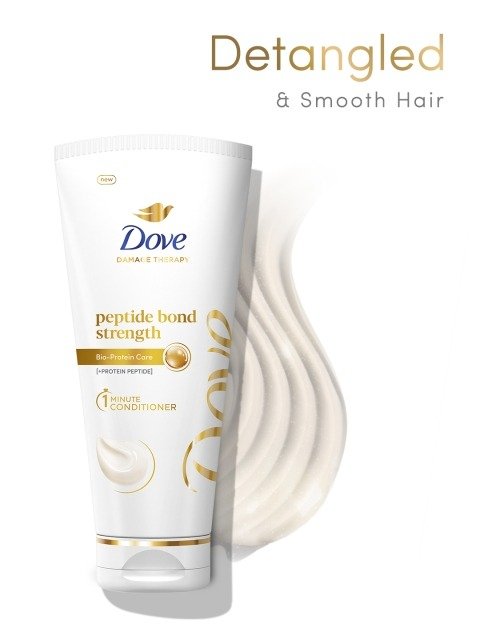 DETANGLES HAIR & ,REPAIRS DAMAGE: Dove Peptide Bond Strength Conditioner with Protein Peptides repairs damage and fortifies hair structures giving you detangled ,smooth and fortified hairDOES NOT WEIGH HAIR DOWN: It nourishes tangled and frizzy hair without weighing it down. For best results ,apply on hair from ears to tips where hair tangles more easily. Dove Peptide Bond Strength Conditioner penetrates deep to reconstruct broken hair bonds and make hair 20X Stronger. Helps protect from damage due to heat ,styling ,dryness or colour treatmentsTAKE THE DOVE CONDITIONER 1 MINUTE COMB CHALLENGE: Use Dove Peptide Bond Strength Conditioner after shampoo ,and see the magic in just 1 minute as your comb slides right through silky ,smooth hair. Shampoo cleans scalp and repairs hair while conditioner deeply nourishes hair. Use Dove conditioner every time after shampoo for detangled ,smooth ,frizz-protected hair that breaks less while combingCARE YOU CAN COUNT ON: Globally ,Dove does not test on animals. Our hair care products are PETA approved and vegan. |